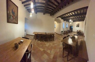 Puoi degustare il tuo piatto comodamente seduto all'interno del convento, in un luogo accogliente e conviviale. La nostra sala è arredata in stile refettorio, unico nel suo genere, creando un'atmosfera rilassante e suggestiva.